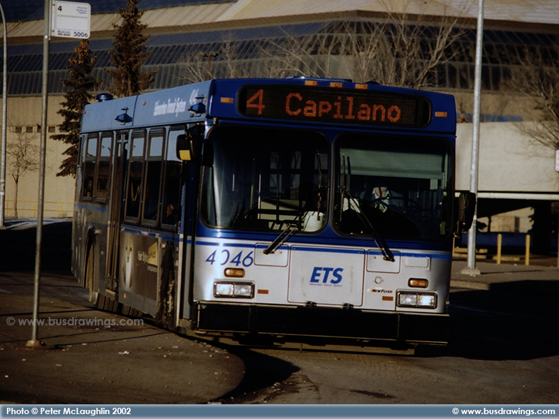 #4046 is seen taking a break at the West Edmonton Mall on Christmas Day, December 25, 2002 while assigned to a route 4 Capilano. I then hopped on board and took a ride to the University of Alberta on this bus. See the next shot. Photo Captured by Peter McLaughlin. | |