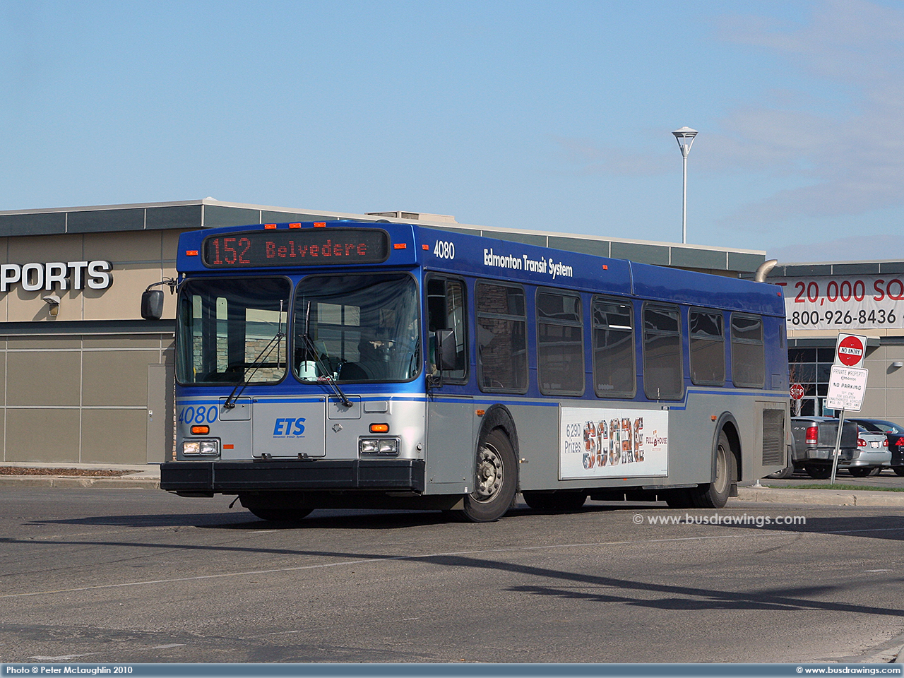 Here is #4046 waiting for passengers at the University of Alberta after arriving from the West Edmonton Mall as a route 4 on December 25, 2002 when I rode it. Photo by Peter McLaughlin. | |