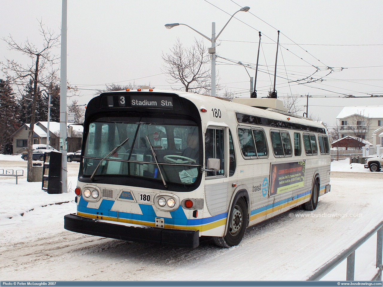 #180 is seen arriving at the Jasper Place Transit Centre on February 5, 2007. Photos captured by Peter McLaughlin. | |
