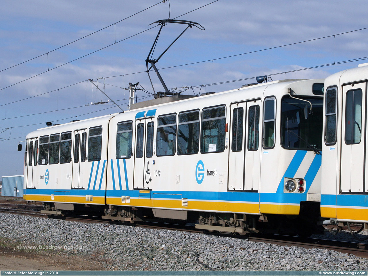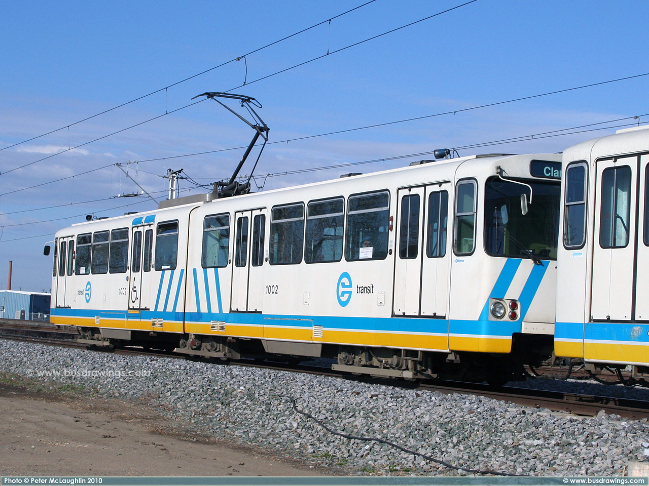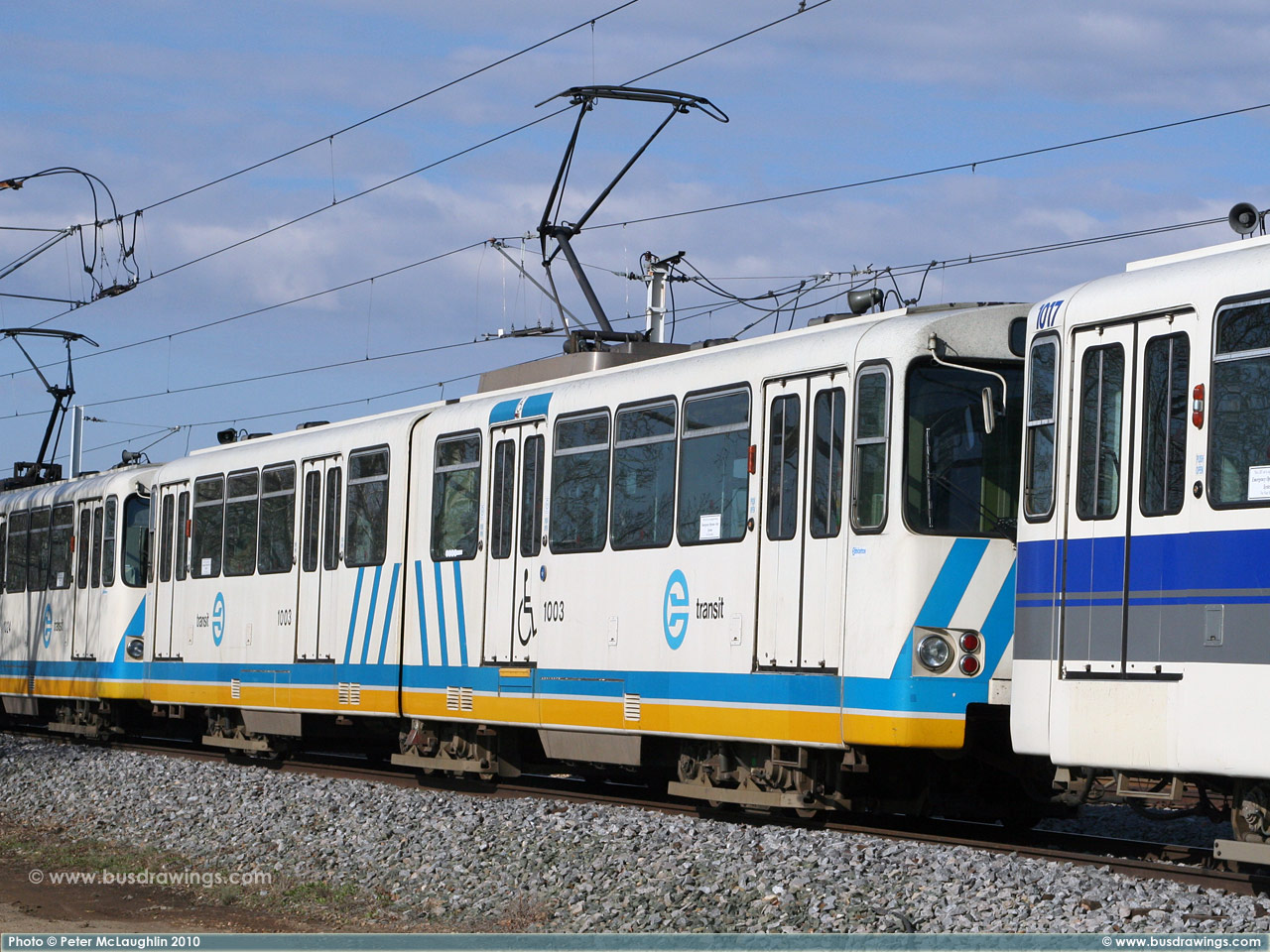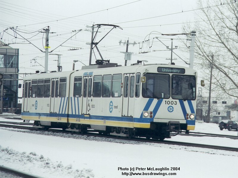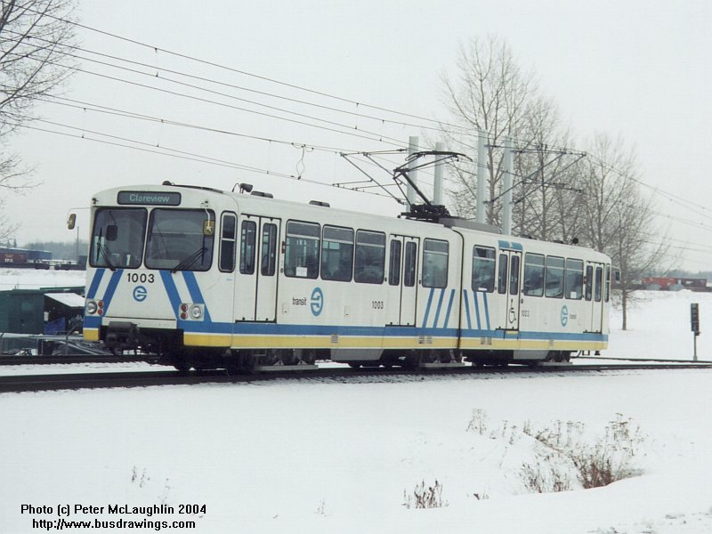 #1003 is seen heading towards the Clairview LRT Station in North East Edmonton in these two shots taken near the Belvedere Station on February 15, 2004 by Peter McLaughlin. | |
