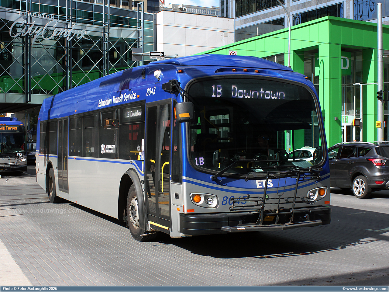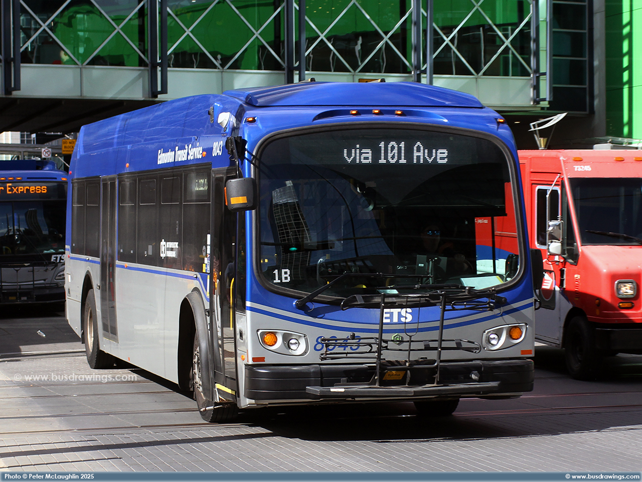 #8043 is seen in the downtown core Southbound on 101 St. at 102 Ave. while working a route 1B on July 25, 2025. Photos captured by Peter McLaughlin. | |