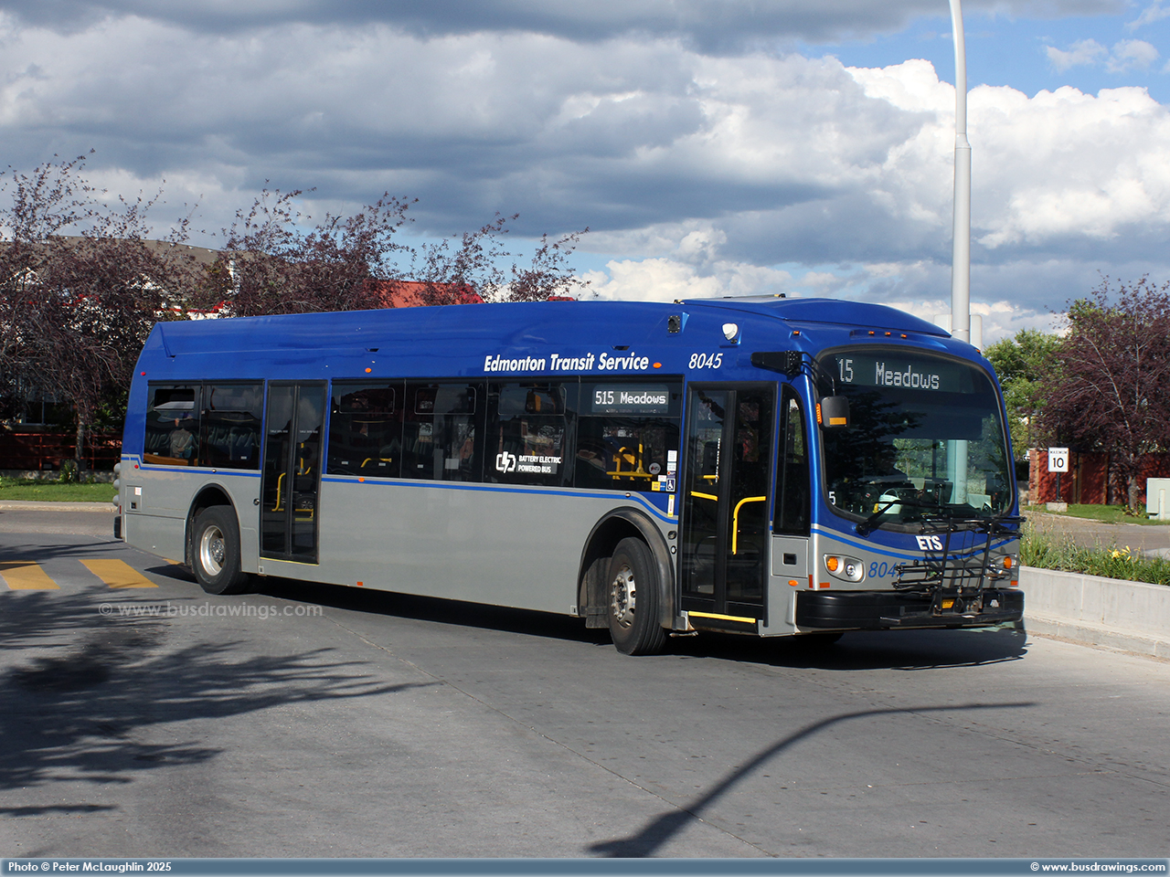 #8045 is seen arriving at the Mill Woods Transit Centre as a route 515 on July 25, 2025. Photo captured by Peter McLaughlin. | |