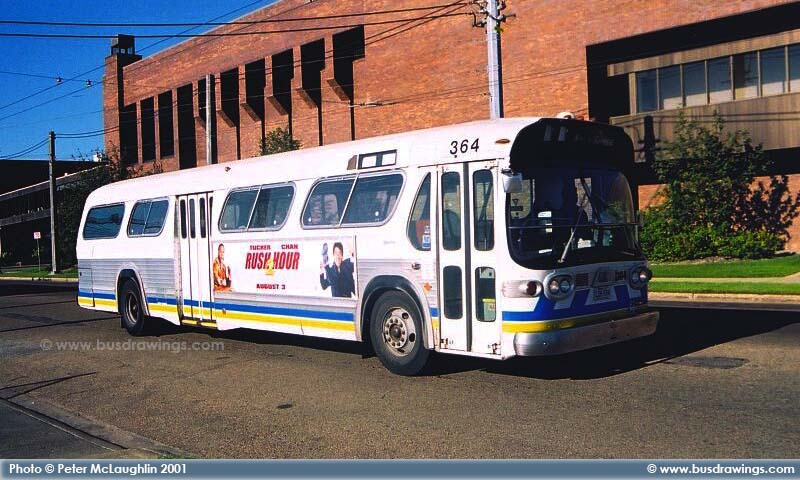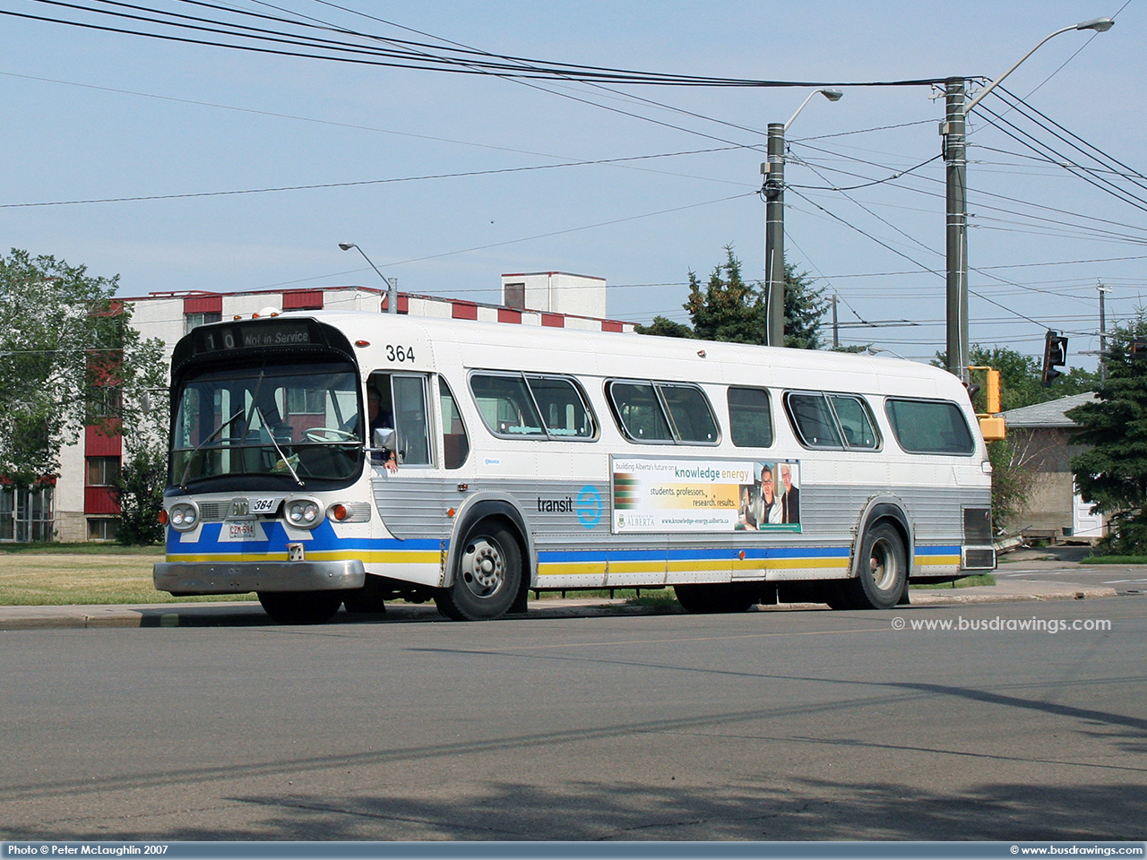 #364 heads back to Edmonton Transit's Westwood Garage after the morning rush hour on July 31, 2001. Photo by Peter McLaughlin. | |