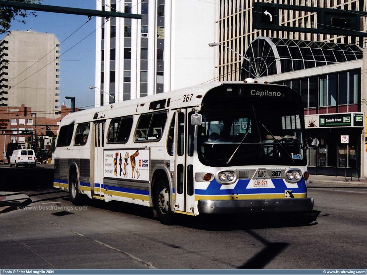 #367 is seen working in the Downtown core on Jasper Ave. as a route 1 Capilano in this shot captured by Peter McLaughlin in August 2004. | |