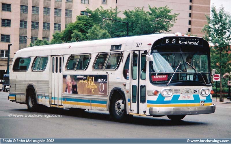 #371 is seen leaving the downtown core as a route 65 Knottwood in this view captured on June 28, 2002 by Peter McLaughlin. | |