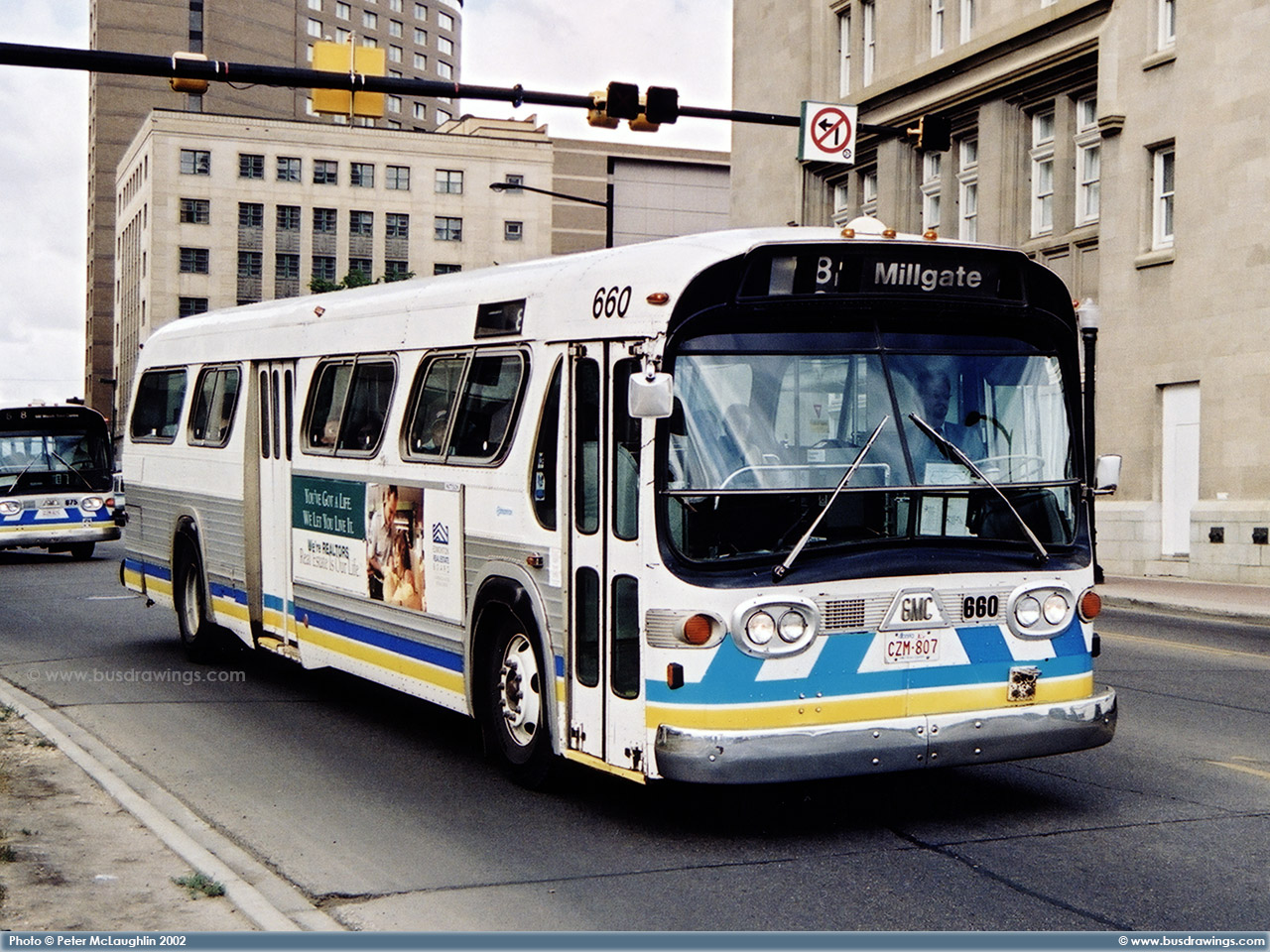 #660 is seen leaving the Downtown core southbound as a route 8 Millgate in this view captured by Peter McLaughlin in June of 2002. | |