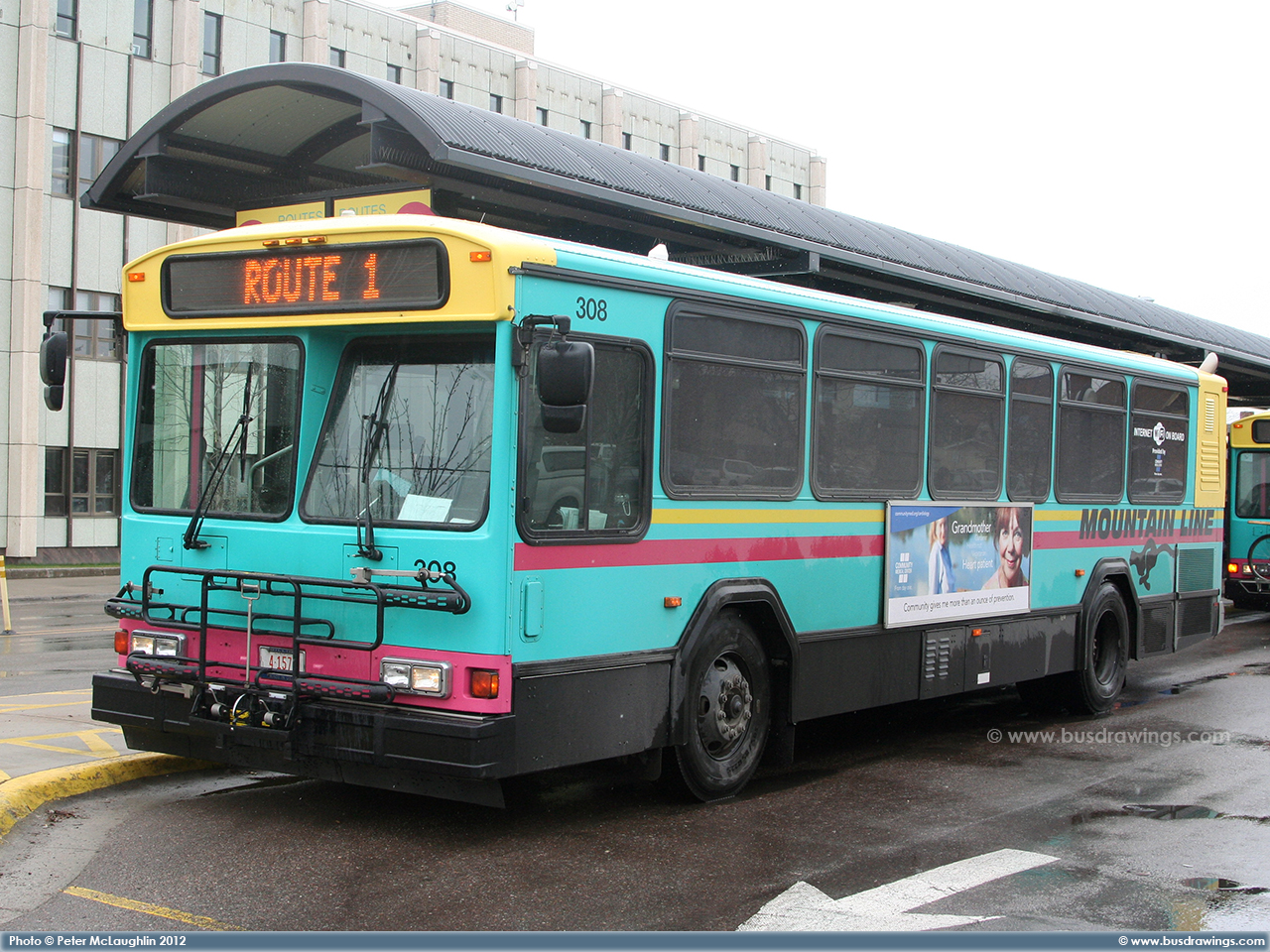 #308 on layover at the downtown Transit Terminal on April 6, 2012. Photos captured by Peter McLaughlin. | |
