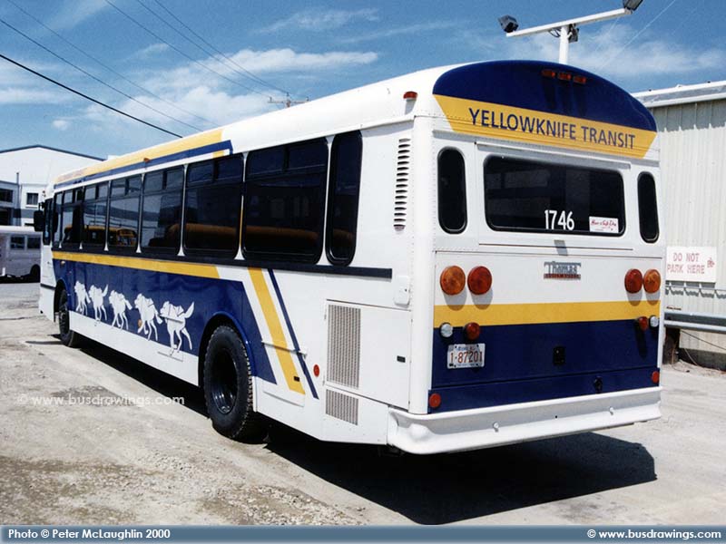#1746 is seen at the Cardinal Coach Lines in Calgary, Alberta before being delivered to Yellowknife Transit in the Summer of 2000. Photo captured by Peter McLaughlin. | |