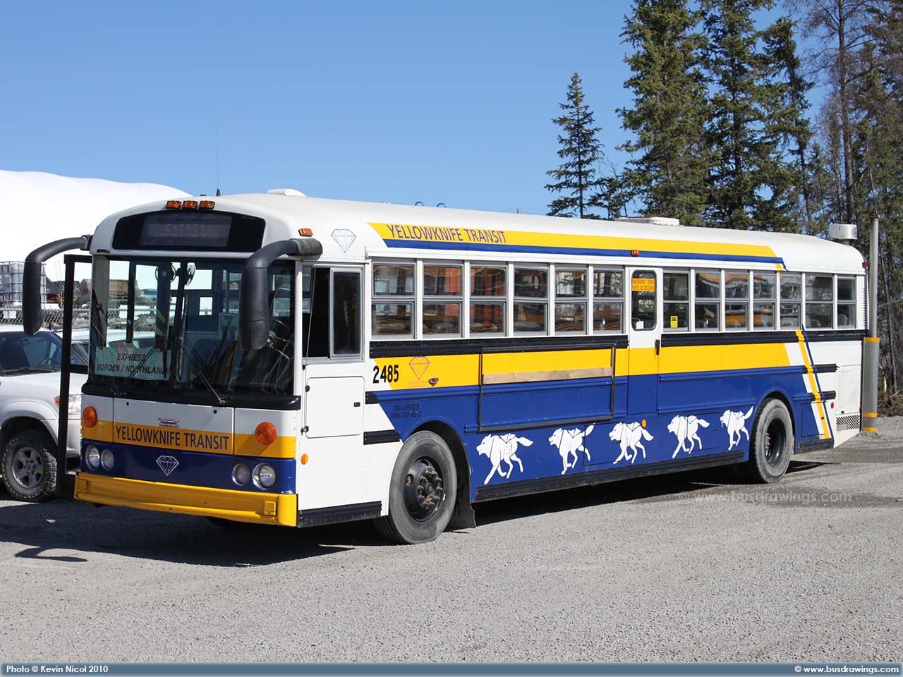 #2485 is seen resting at the Yellowknife Transit Yard on April 29, 2010. Photo captured by Kevin Nicol. | |