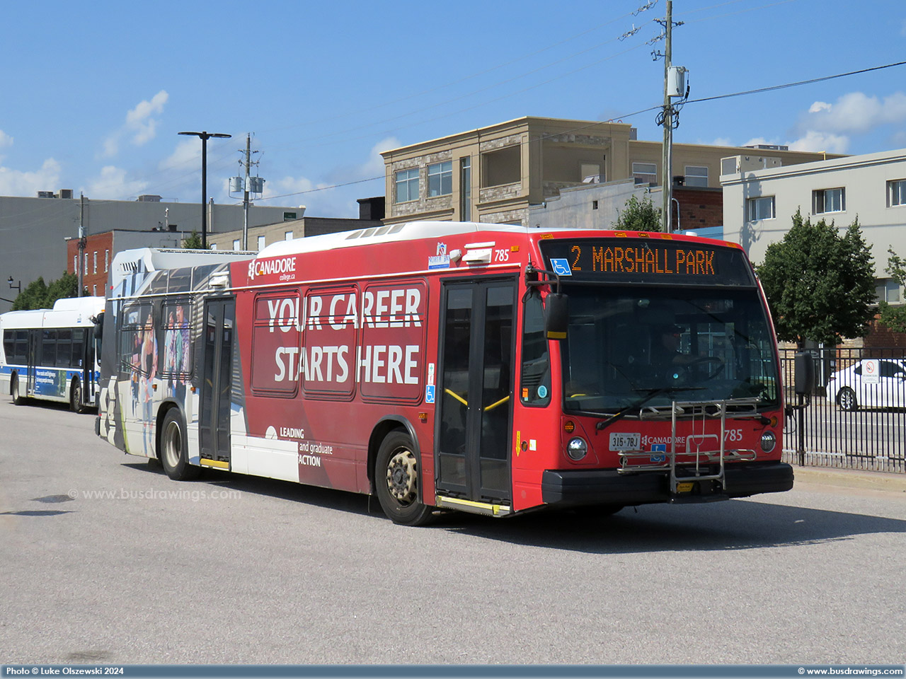 #785 is seen at the downtown terminal on July 16, 2024. Photo captured by Luke Olszewski. | |