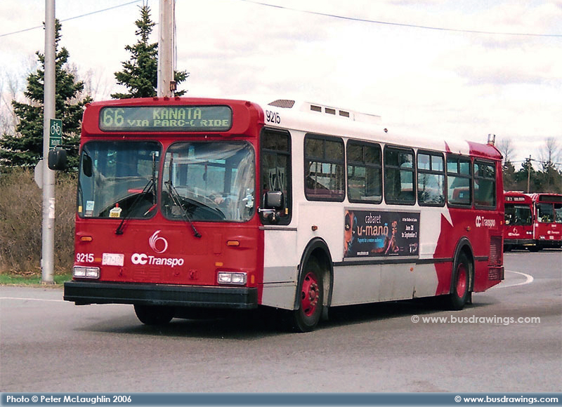 #9215 is seen heading into the Hurdman Station to work as a route 66 in this view taken on April 18, 2006 by Peter McLaughlin. | |