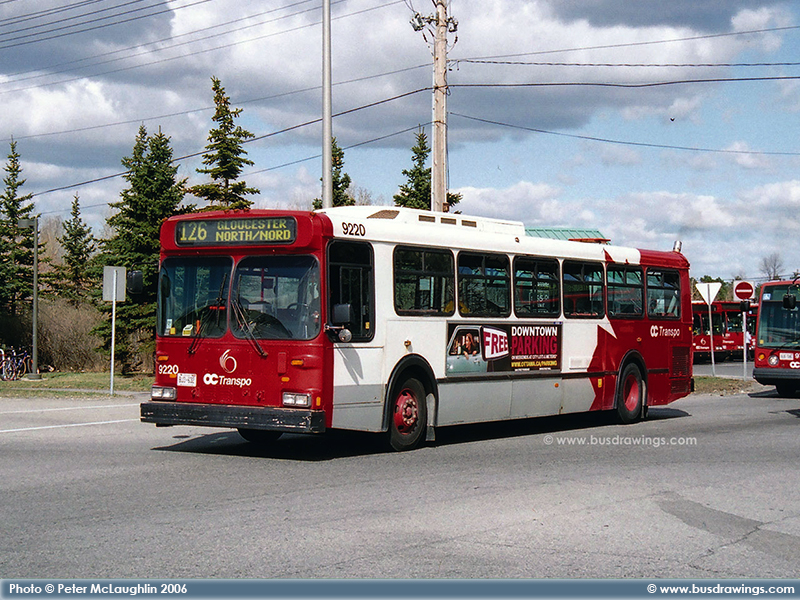 #9220 is seen arriving at the Hurdman Station with signs displaying route 126 Gloucester North in this view captured on April 18, 2006 bby Peter McLaughlin. | |