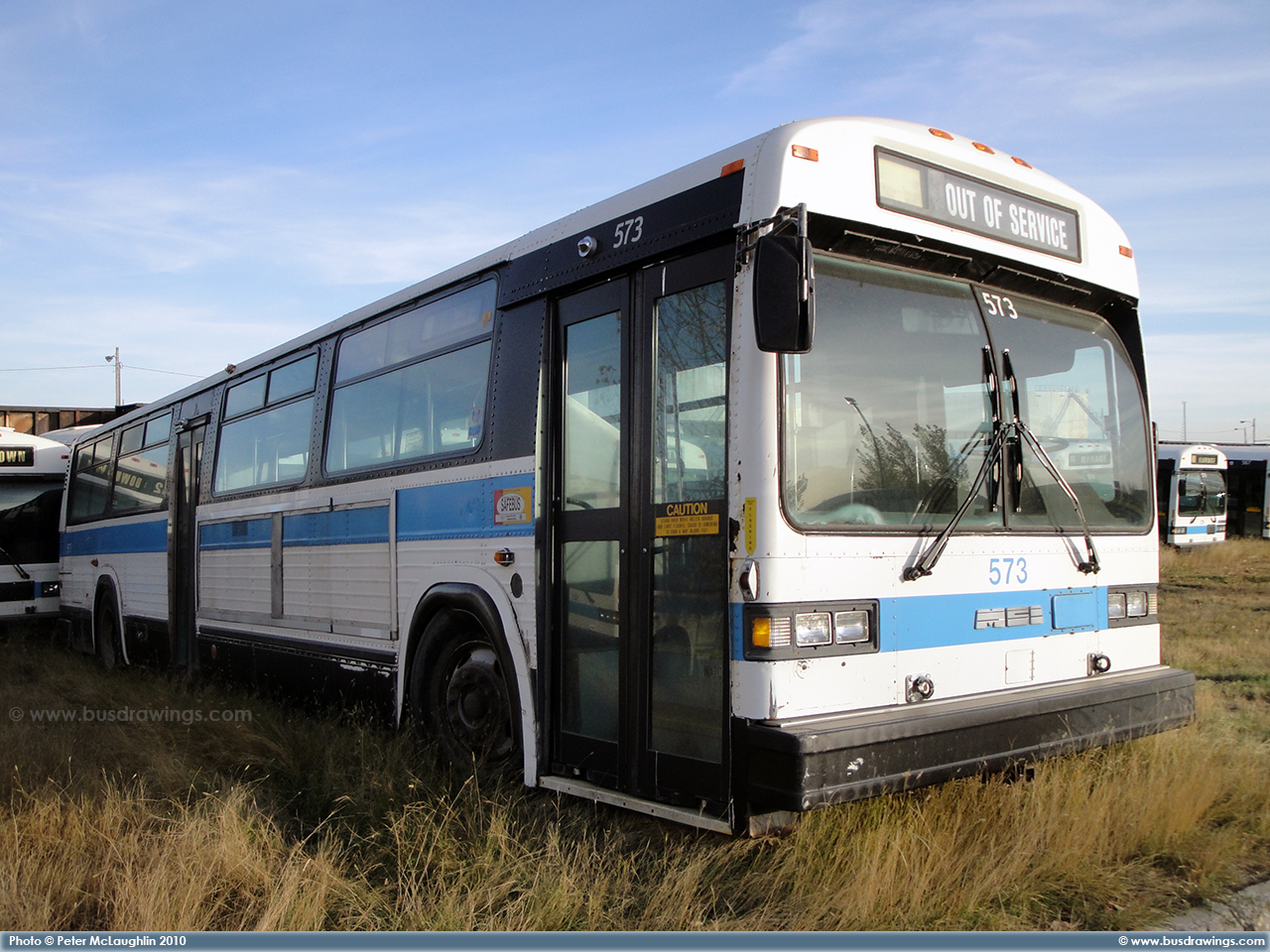 #573 parked and retired at the Regina Transit garage on October 22, 2010. This bus is now Saskatoon Transit Services #573. Photo captured by Peter McLaughlin. | |