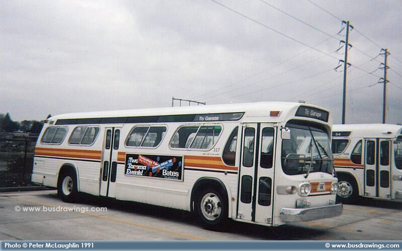 #337 is seen parked at the Pierce Transit Garage waiting for her next assignment in this view captured by Peter McLaughlin in March 1991. | |