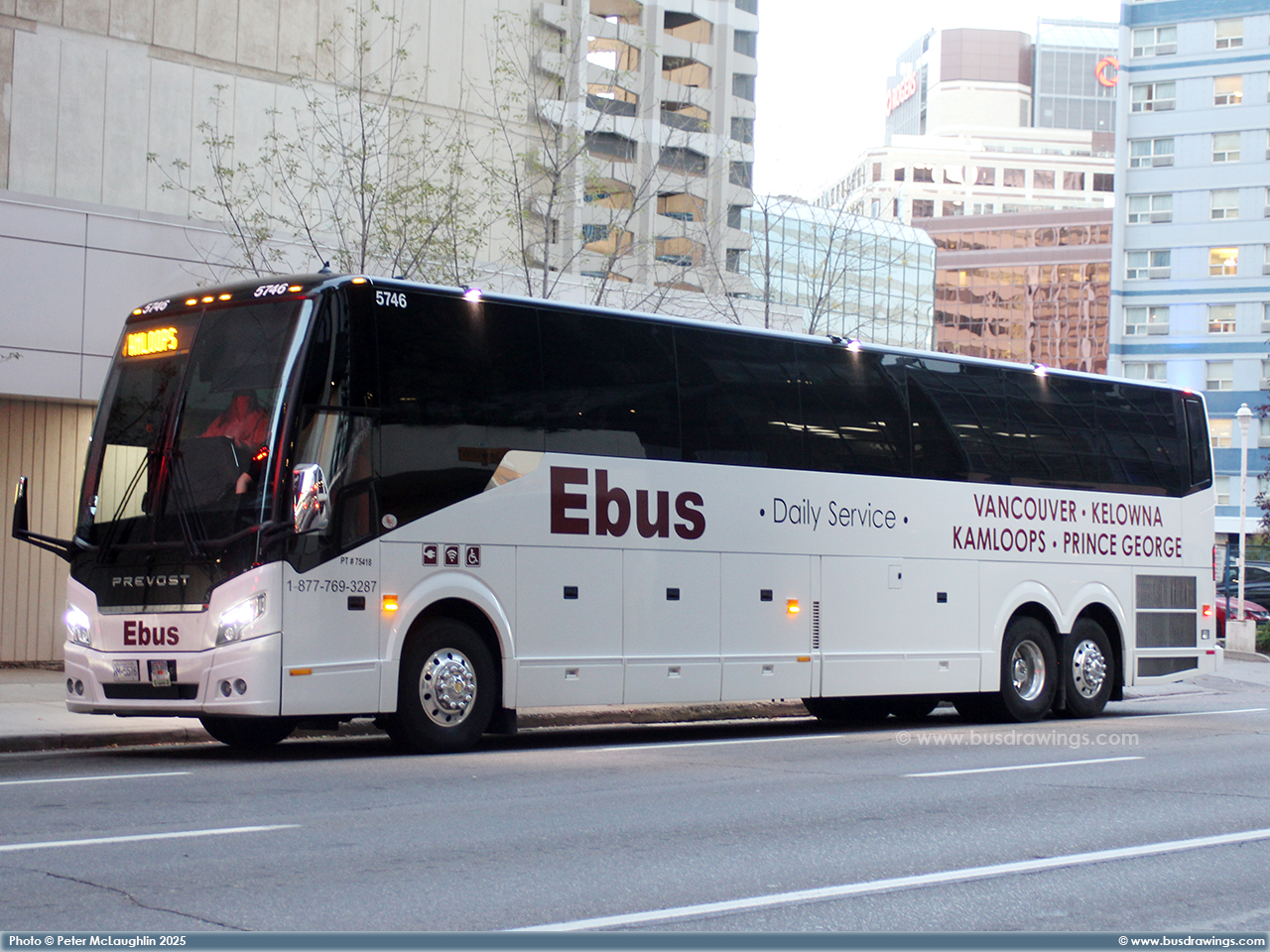 #5746 is seen at the downtown Calgary, Alberta Red Arrow / Ebus stop on 5th Street at 5th Ave. S.W. preparing to depart for Kamloops via Salmon Arm on October 11, 2025. Photo captured by Peter McLaughlin. | |