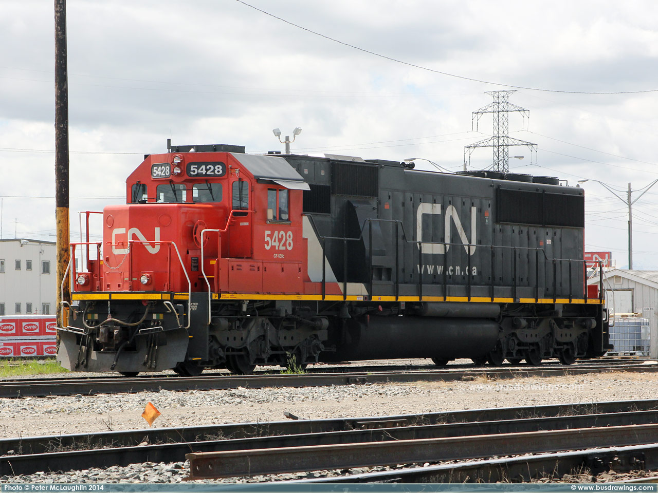 #5428 is seen resting at the CN Sarcee yard in S.E. Calgary, Alberta on June 9, 2014. Photo captured by Peter McLaughlin. |