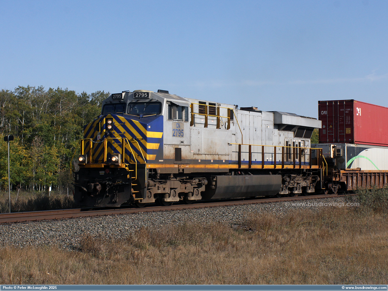 #2795 is seen leading an Intermodal Priority Stack train Westbound on the Wainwright Subdivision West of Wainwright, Alberta on September 20, 2025. Photo captured by Peter McLaughlin. |