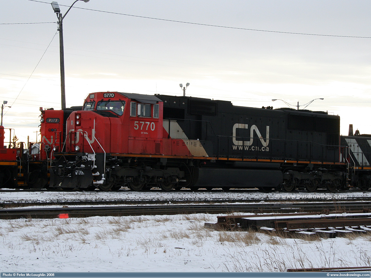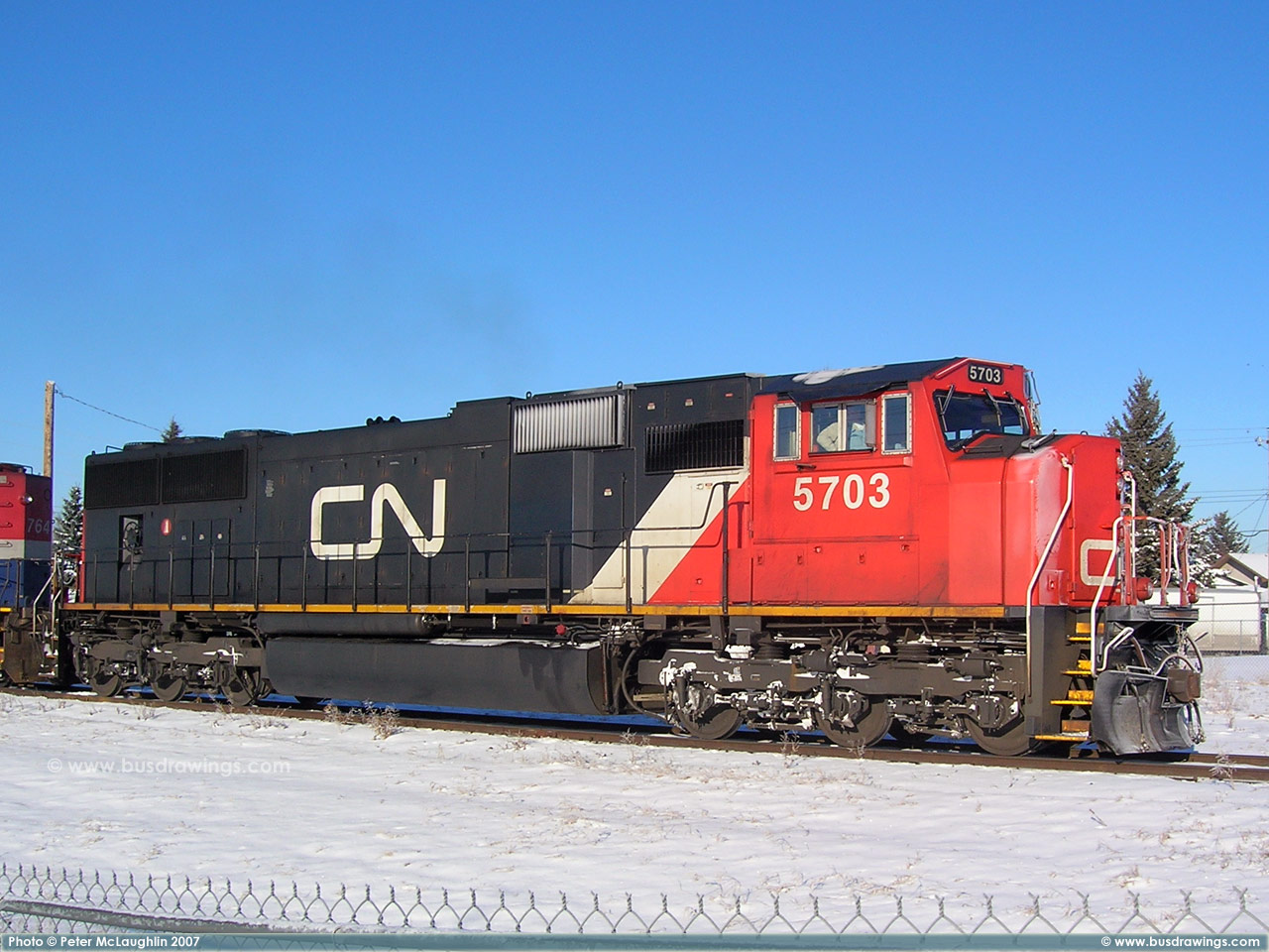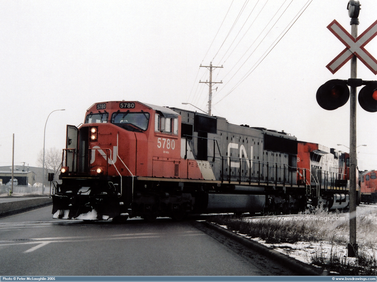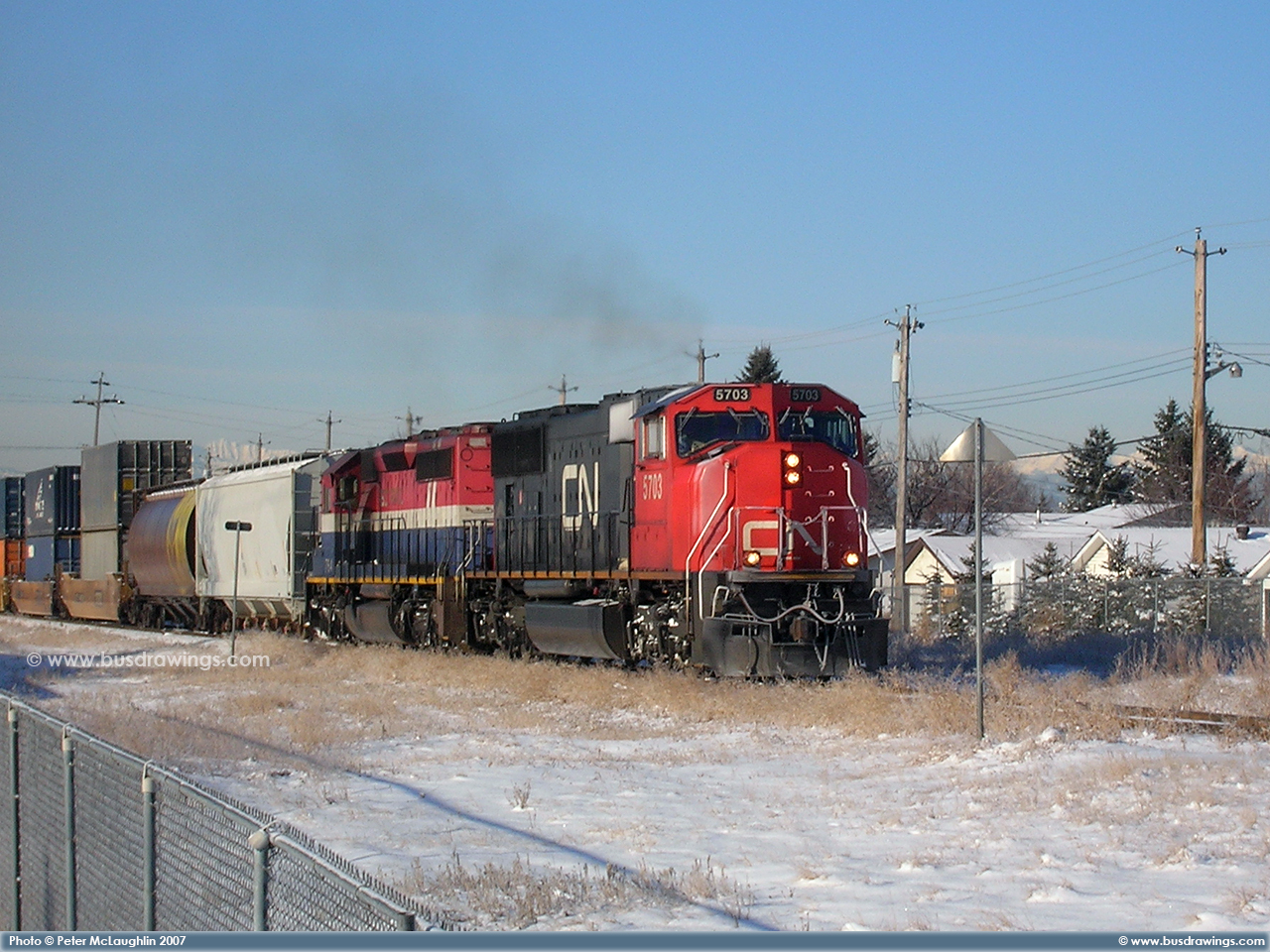 #5780 is seen leading CN #'s 2658 and 6928 as they depart light loaded out of the Sarcee yard in S.E. Calgary in December of 2005. Exact date unknown. Photo captured by Peter McLaughlin. |