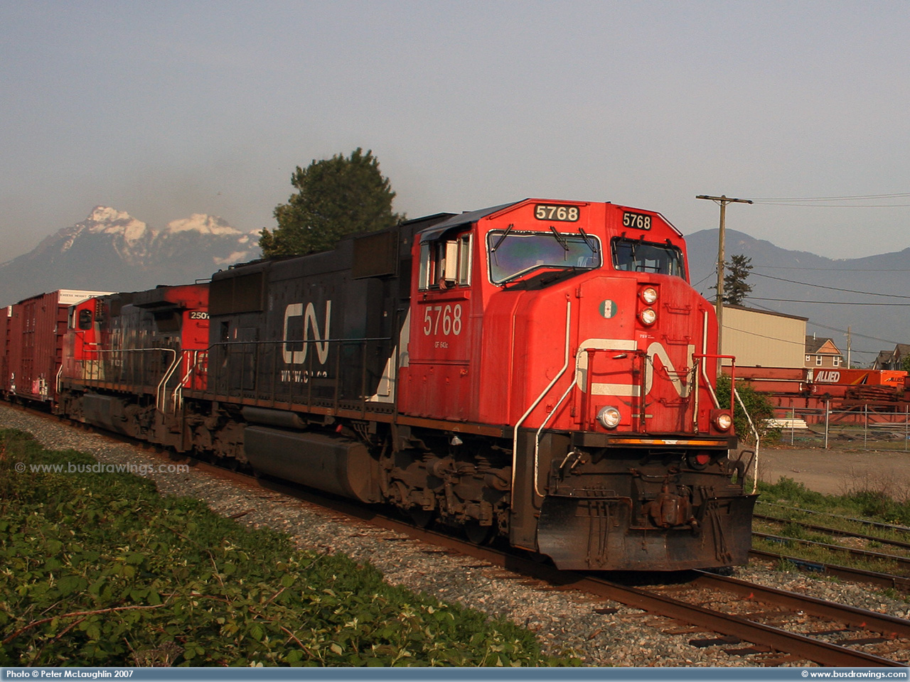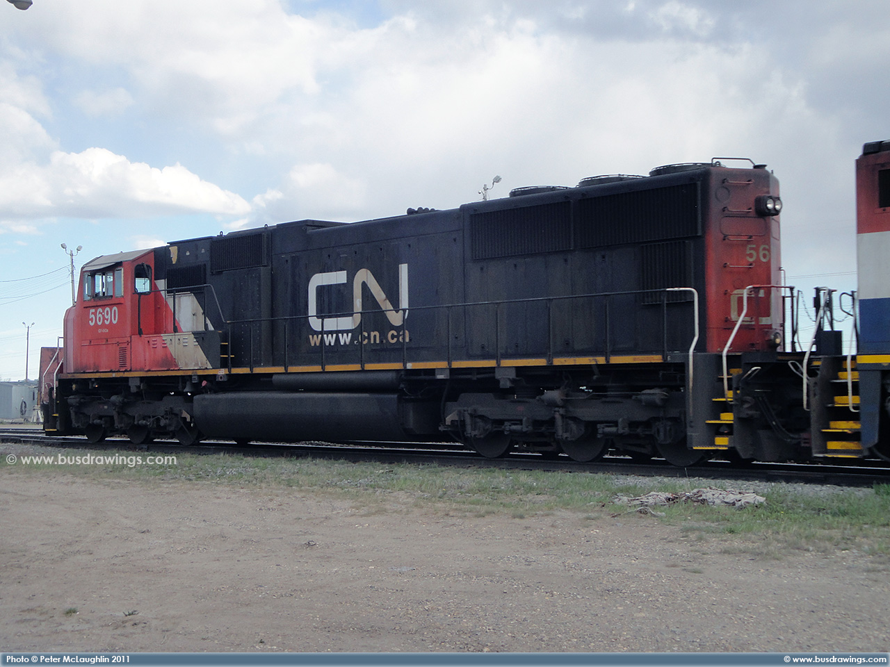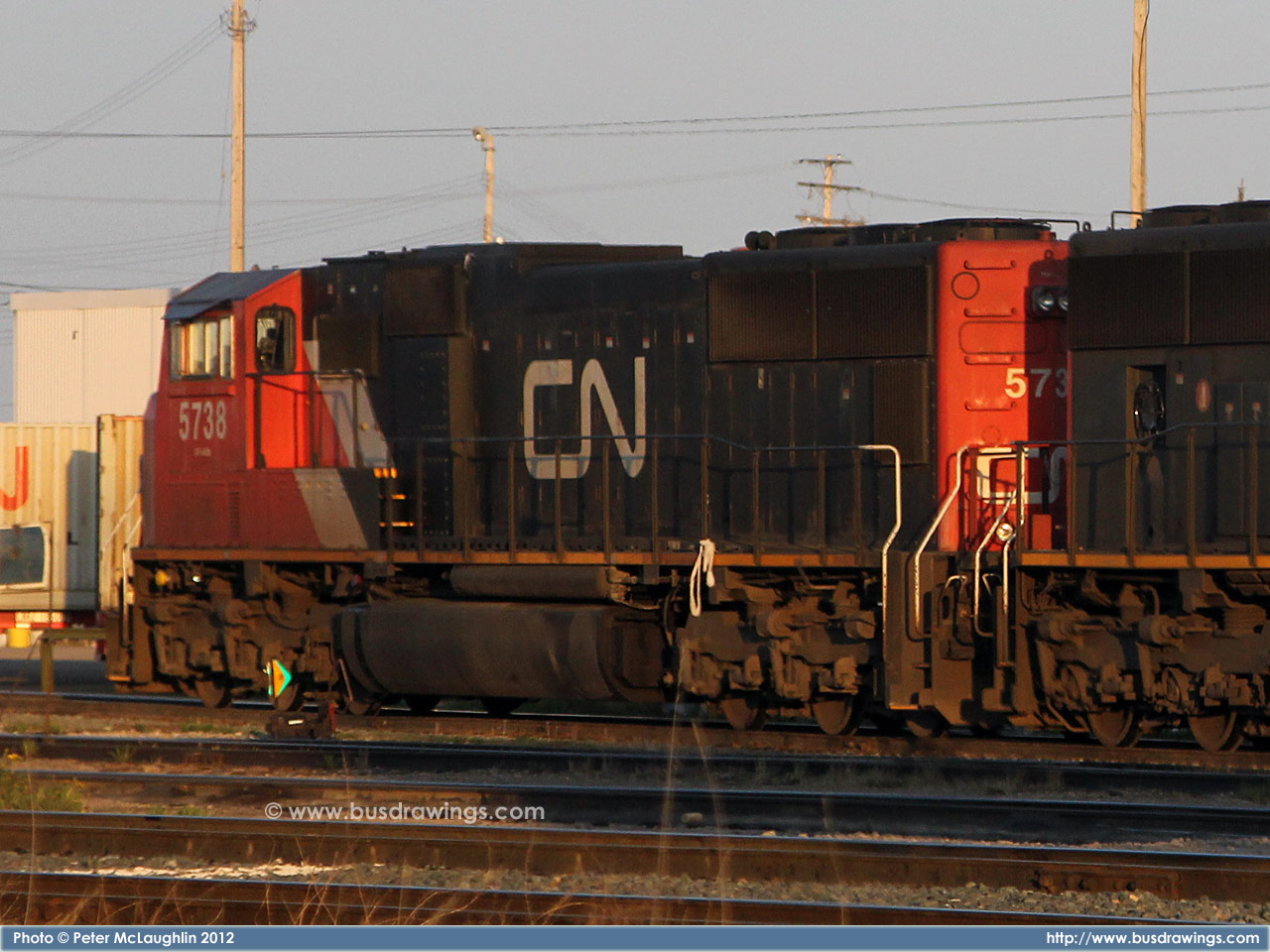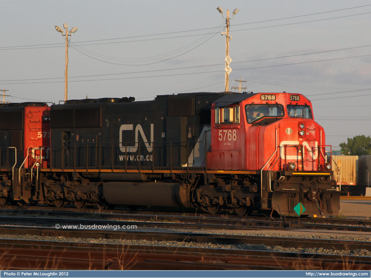 #5762 is seen trailing behind 5663 which was leading a northbound freight train on the CN Sangudo Subdivision in Mayerthorpe, Alberta at Mile 74.24 on September 15, 2012. Photo captured by Peter McLaughlin. |