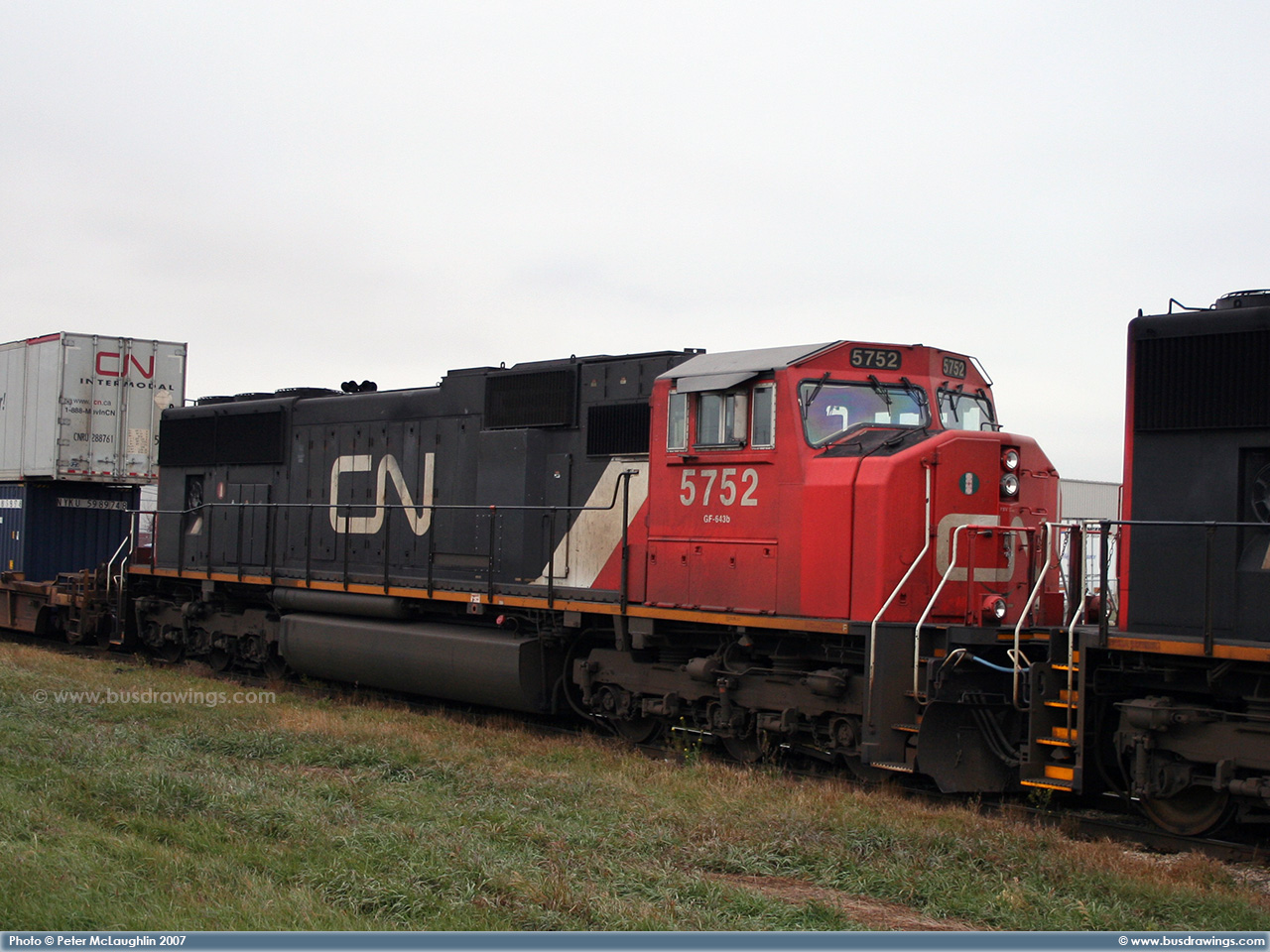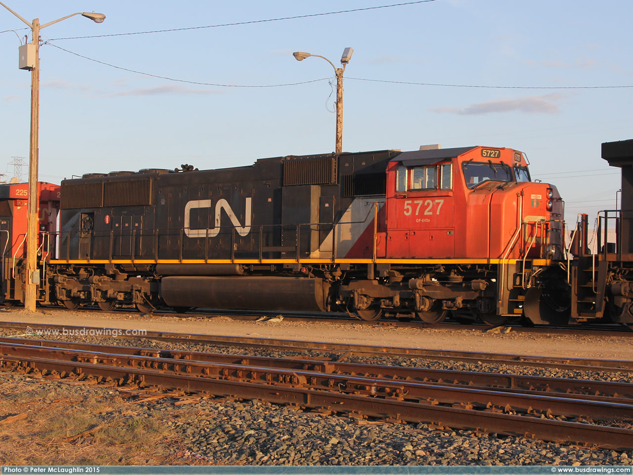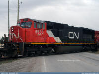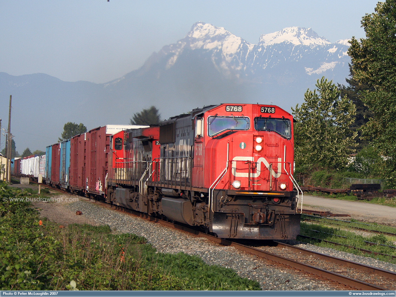 #5762 is seen trailing behind 5663 which was leading a northbound freight train on the CN Sangudo Subdivision in Mayerthorpe, Alberta at Mile 74.24 on September 15, 2012. Photo captured by Peter McLaughlin. |