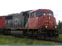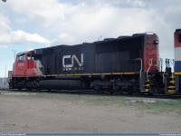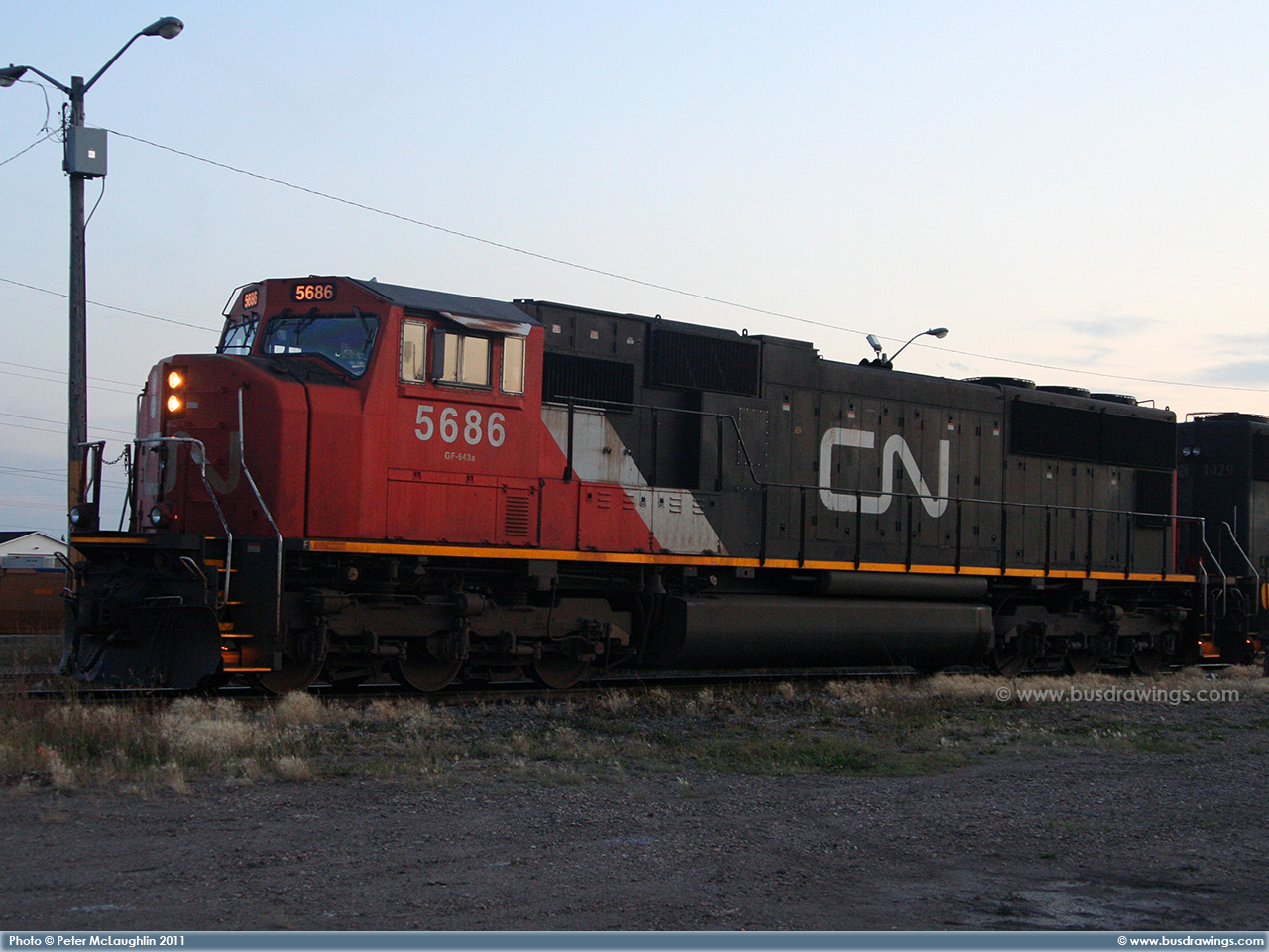 #5663 is seen leading 5762 as they roll along the CN Sangudo Subdivision in Mayerthorpe, Alberta at Mile 74.24 on September 15, 2012. Photo captured by Peter McLaughlin. |