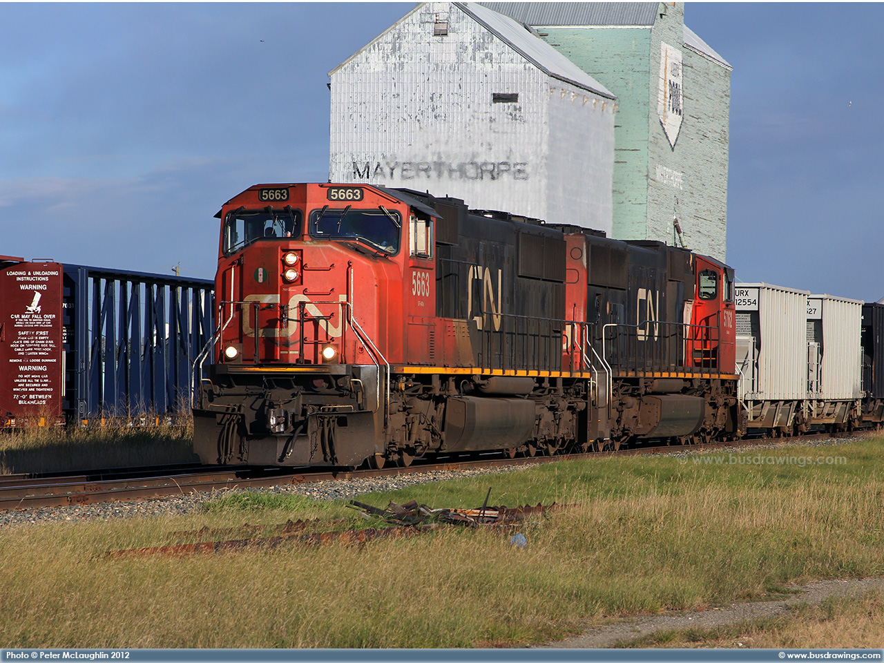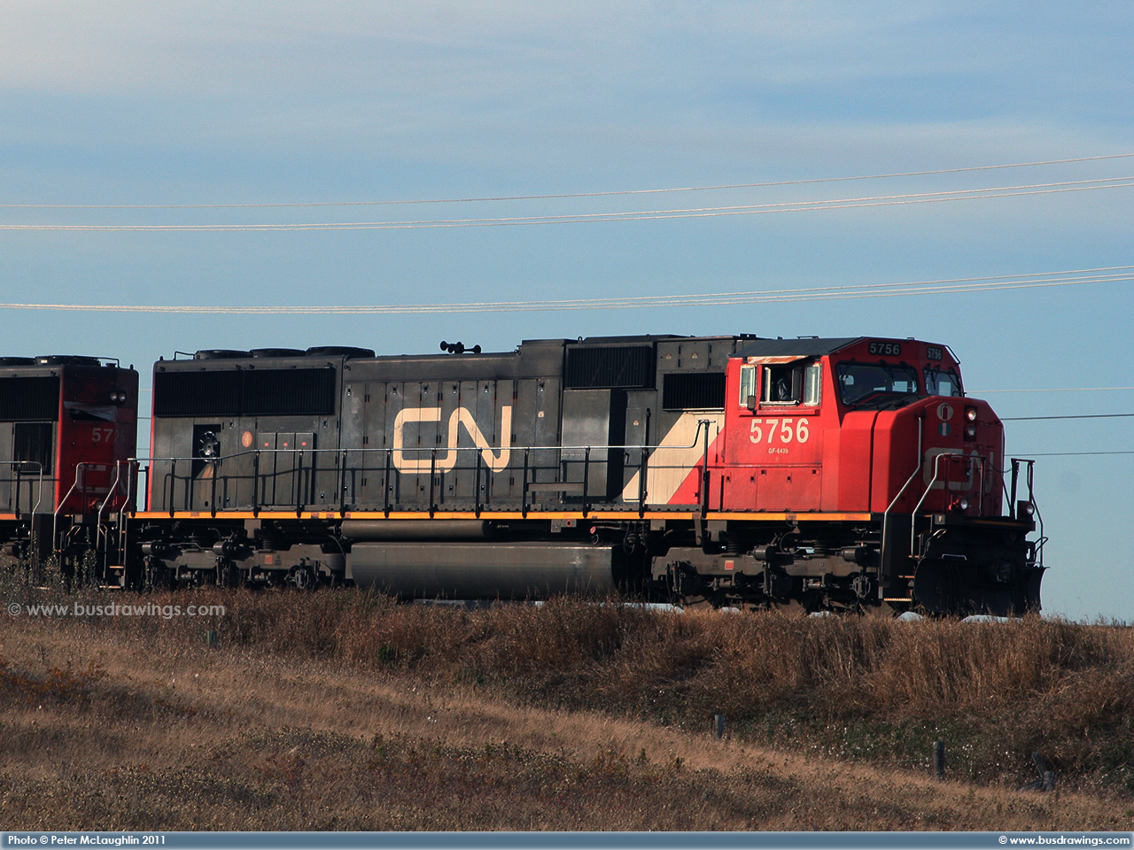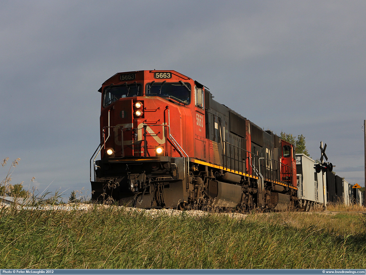 #5663 is seen leading 5762 as they roll along the CN Sangudo Subdivision in Cherhill, Alberta at Mile 51.12 on September 15, 2012. Photo captured by Peter McLaughlin. |