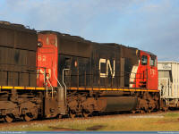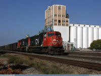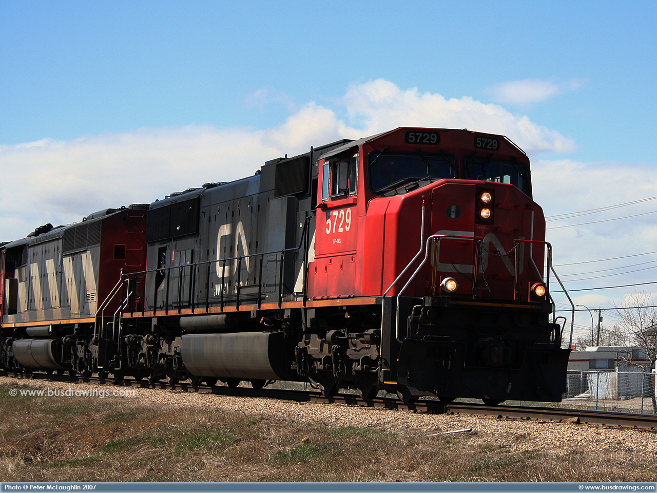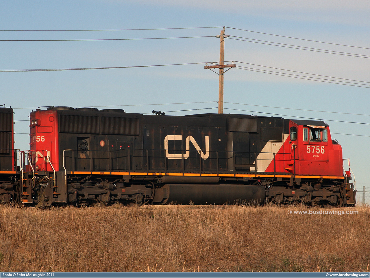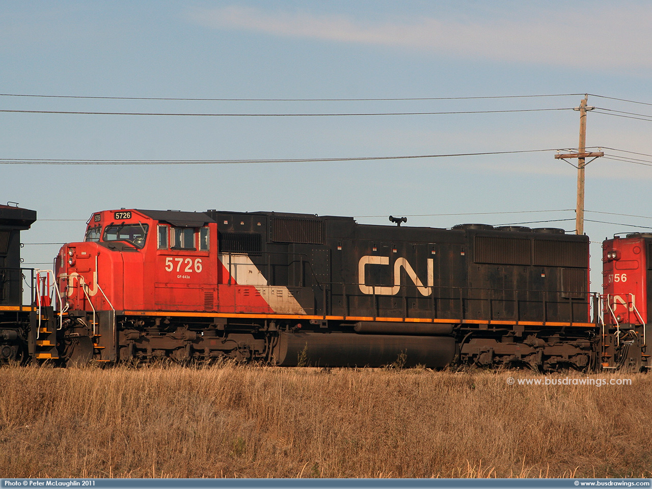 #5663 is seen leading 5762 as they roll along the CN Sangudo Subdivision in Cherhill, Alberta at Mile 51.12 on September 15, 2012. Photo captured by Peter McLaughlin. |
