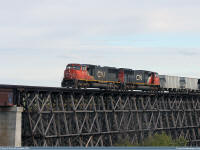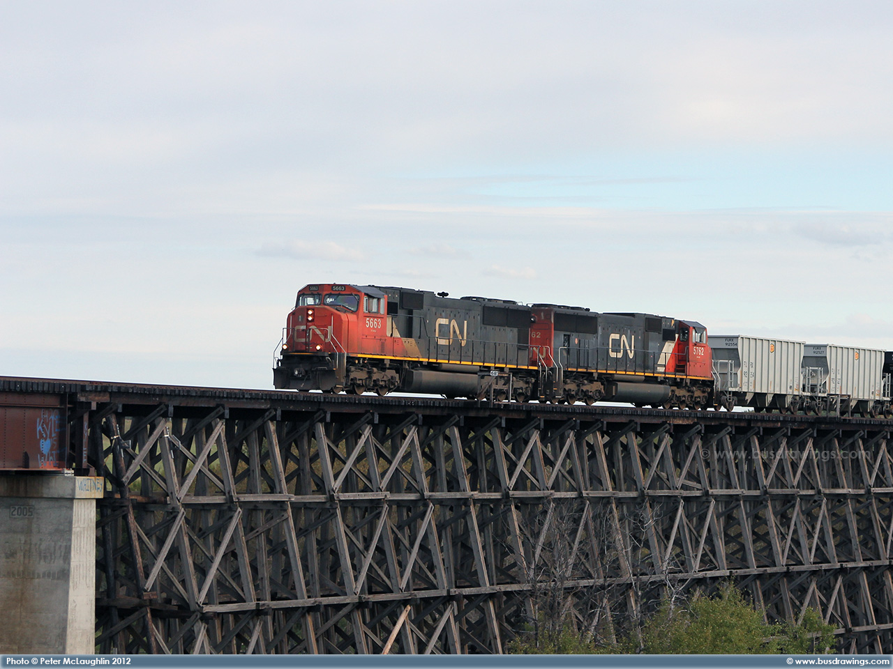 #5663 is seen leading with 5762 trailing as they roll along the CN Sangudo Subdivision on the Rochfort Trestle Bridge just outside of the Hamlet of Rochfort Bridge, Alberta at Mile 68 on September 15, 2012. Photo captured by Peter McLaughlin. |