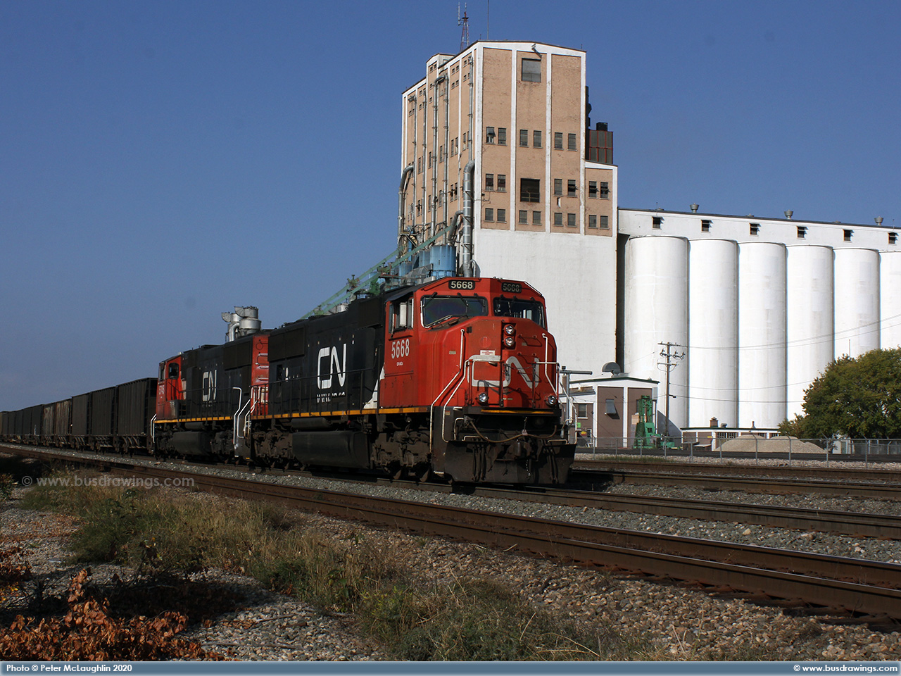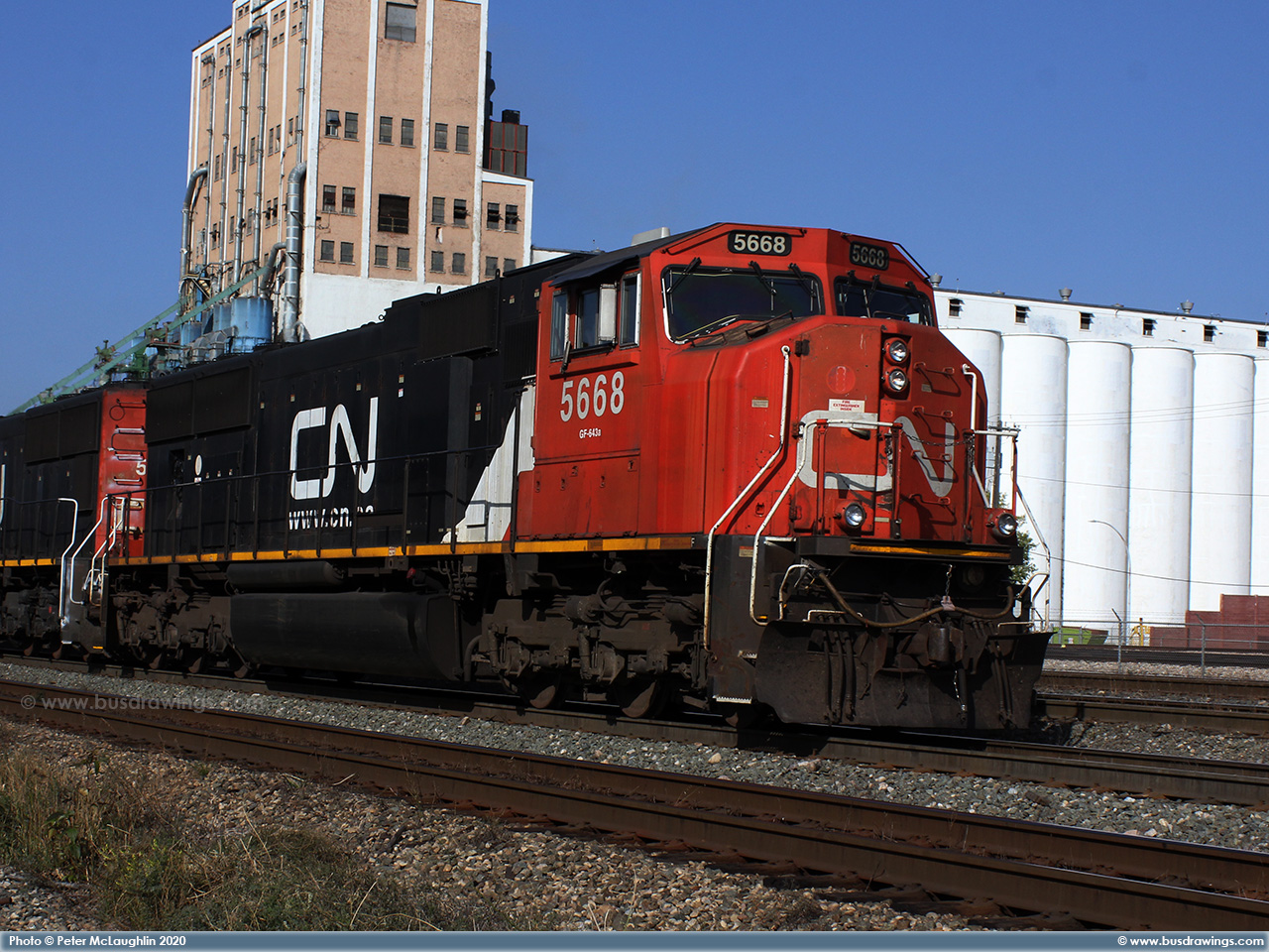 #5668 is seen leading with 5745 trailing as they roll through the CN Walker yard in north Edmonton near 127th Street on the Edson Subdivision on September 16, 2020. Photos captured by Peter McLaughlin. |